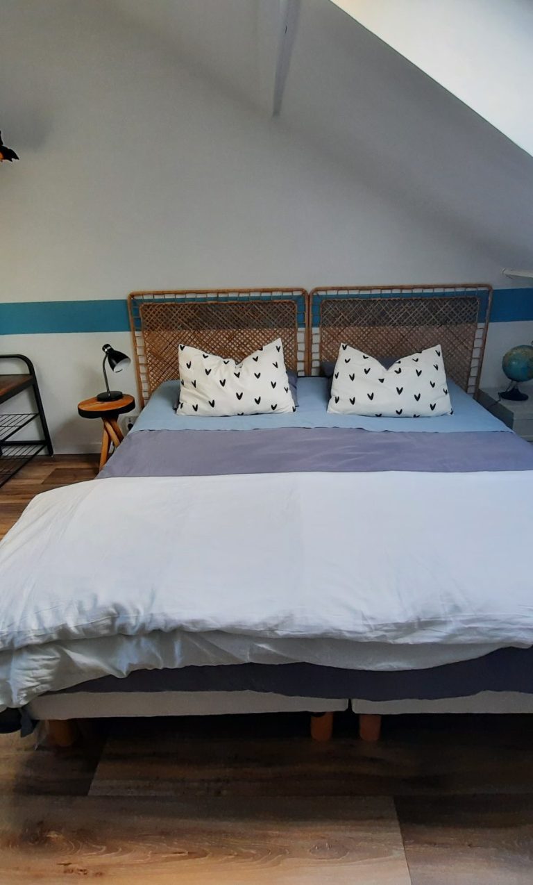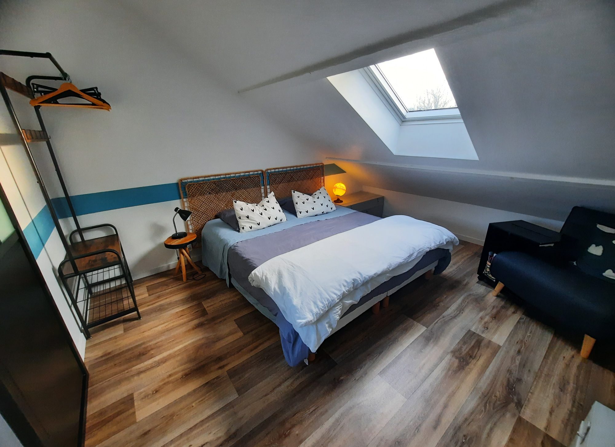 - Étage : chambre lit queen size ou 2 petits lits (80x190), TV et box salle de bain avec baignoire